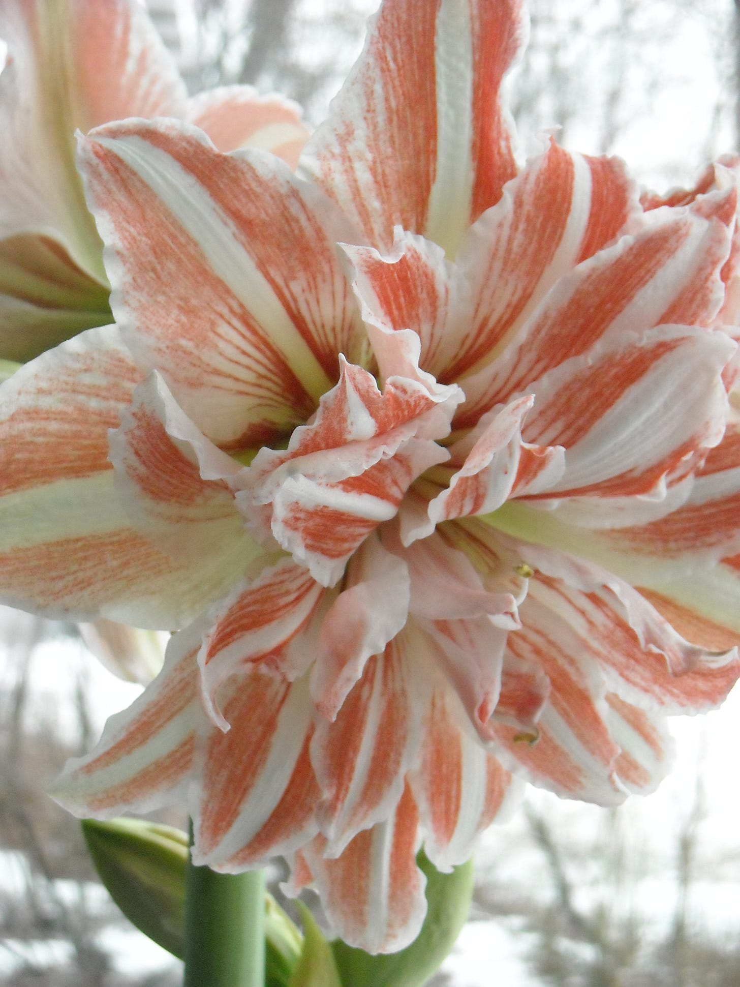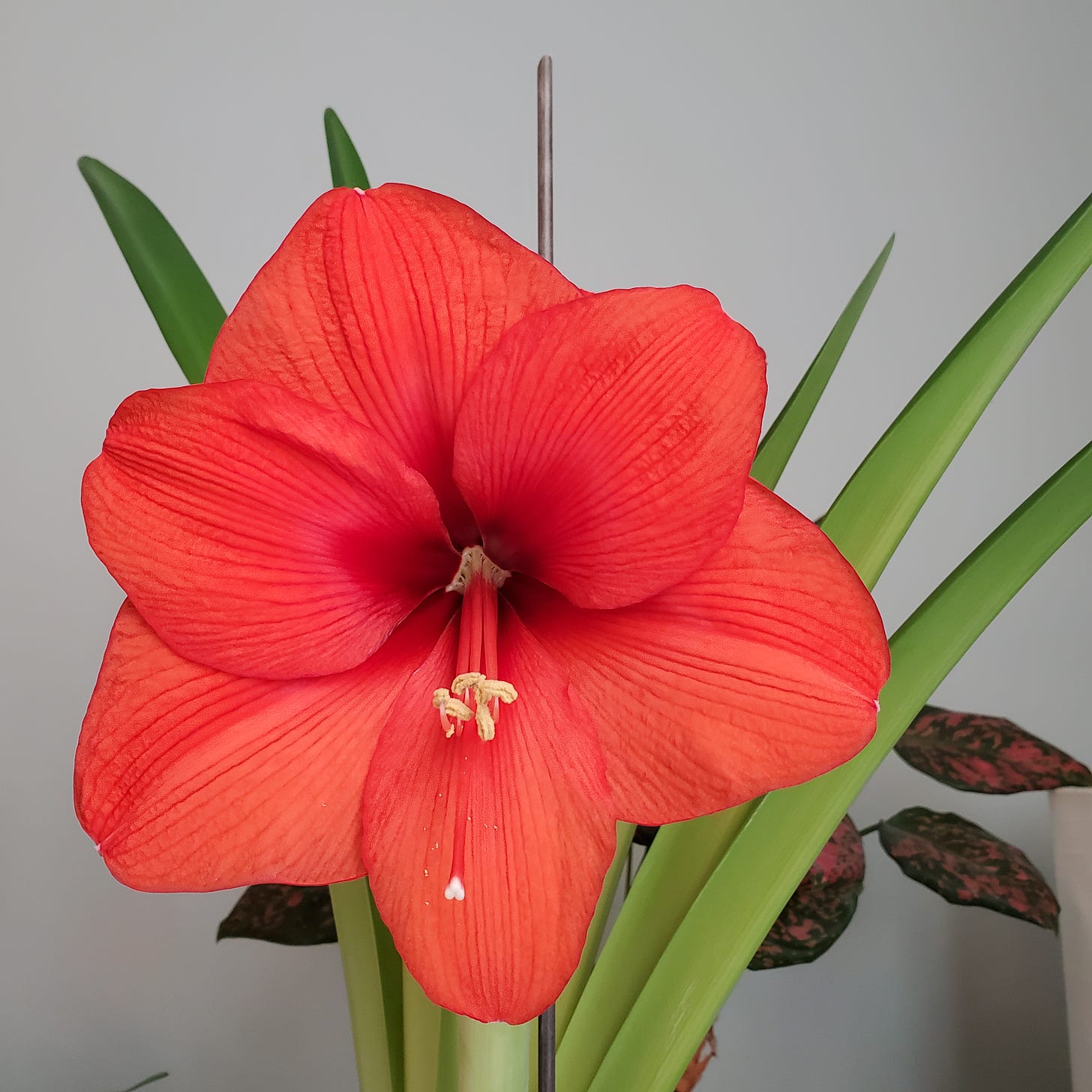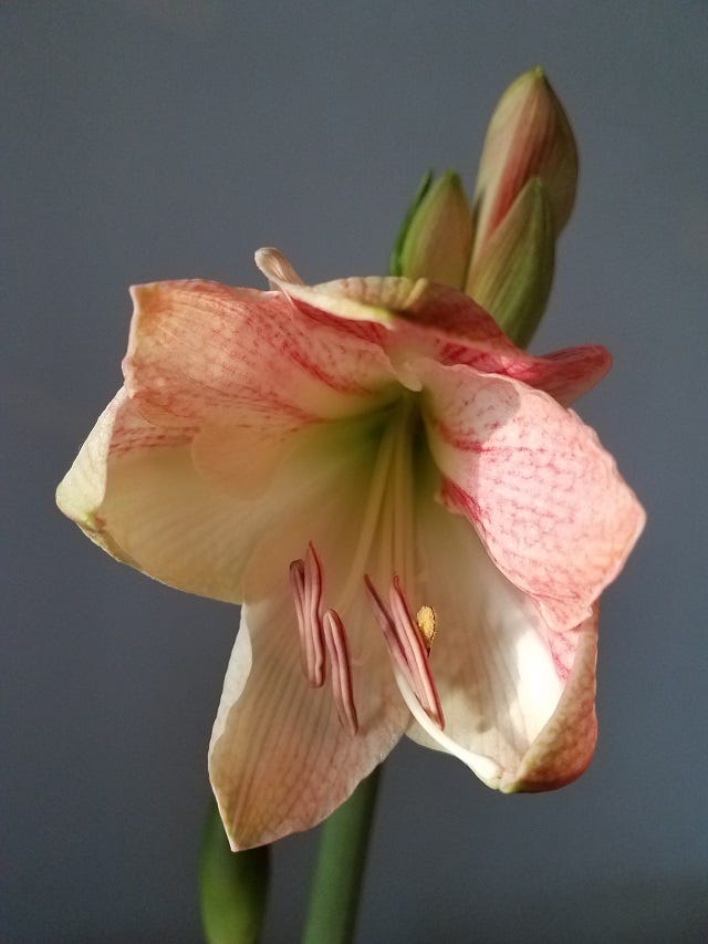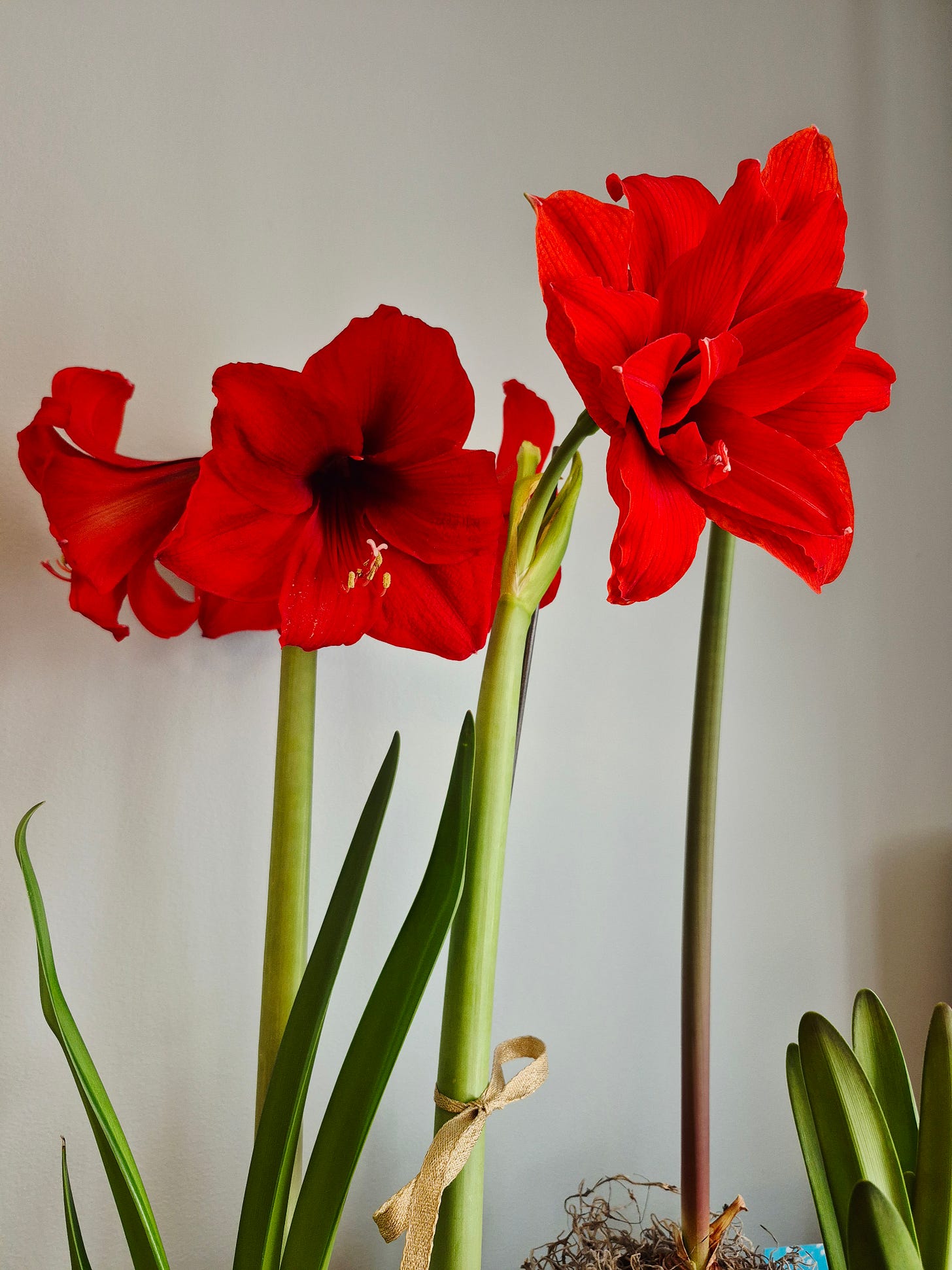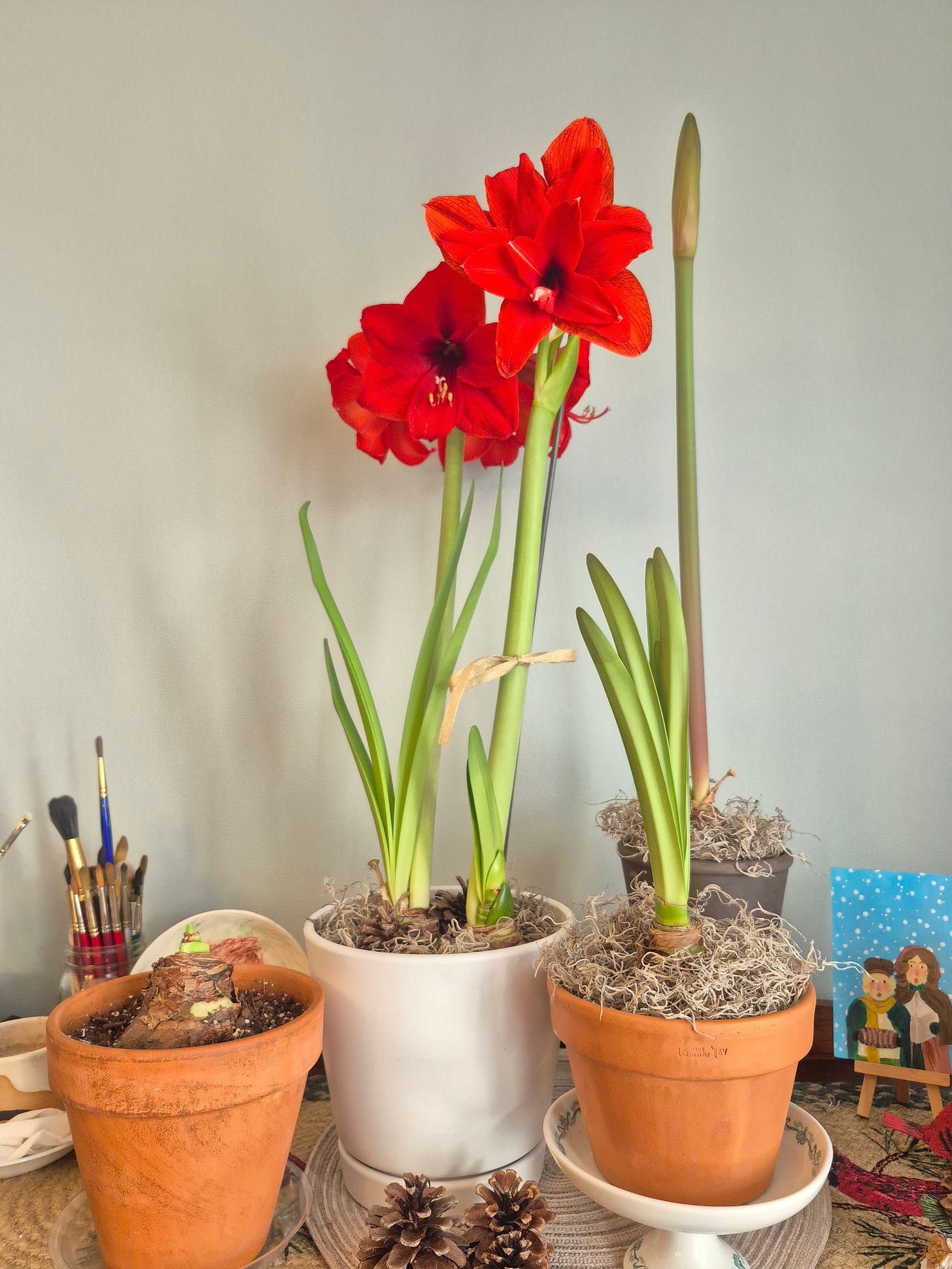 I seem to have been bitten by the bulb bug. Amaryllis bulbs that is. In late fall I potted up four bulbs that were purchased from a big box store. Two (Ferrrari) were for gifts. I potted two (Ferrari and Red Peacock) for me in the white pot above. I loved the look of the group of potted amaryllis so much that my daughter bought me another (front right, Pinkolo) which so far only has leaves. I also bought another (dark pot, Glee). I gifted the two and shortly after bought another, larger bulb (Blossom Peacock) that’s shown on the left. So I have five now.